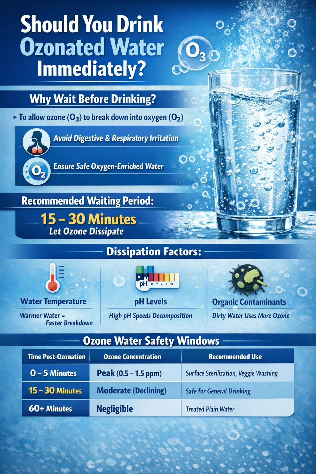 Det korta svaret är nej, vanligtvis bör du vänta minst 15 till 30 minuter efter ozoneringsprocessen innan du dricker vattnet. Medan ozonvatten är exceptionellt effektiv som en desinfektionsmedel , att dricka det medan ozongaskoncentrationen är på topp kan leda till mindre irritation av matsmältningsorganen eller andningsorganen på grund av avgasning av kvarvarande ozonmolekyler.