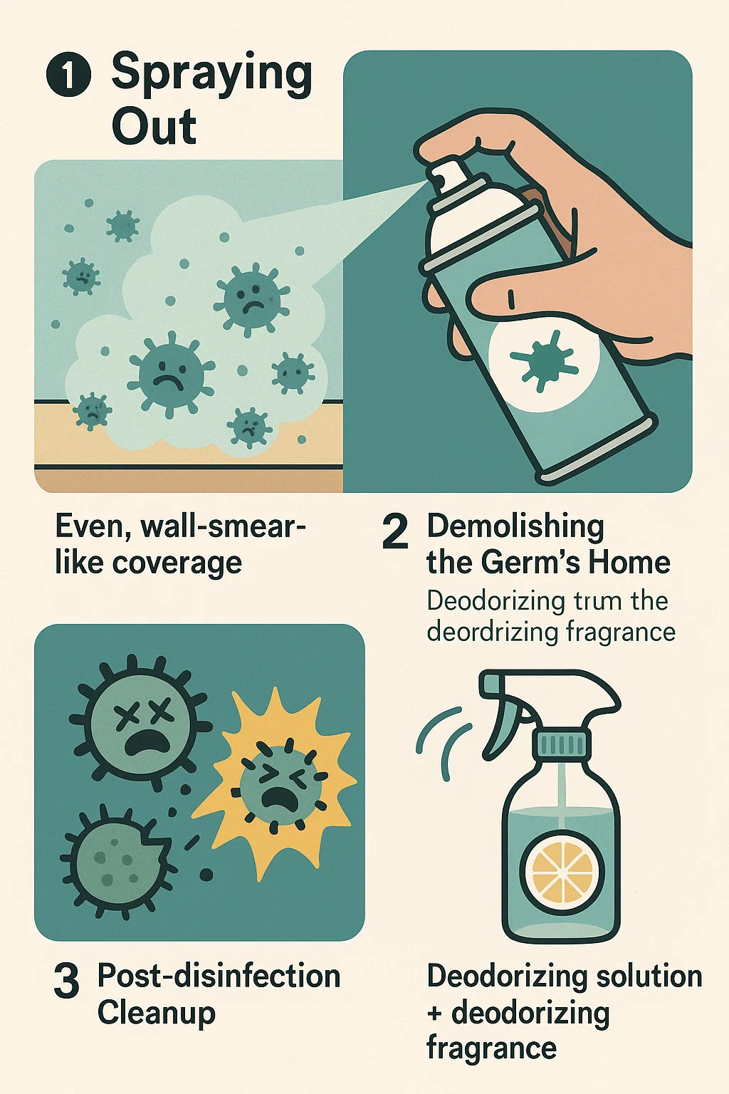 Jämn, väggutstrykningsliknande täckning: Sprayen bryter desinfektionsmedlet till små droppar, som en dimma, som täcker ytor som bordsskivor och dörrhandtag och lämnar inga blinda fläckar.