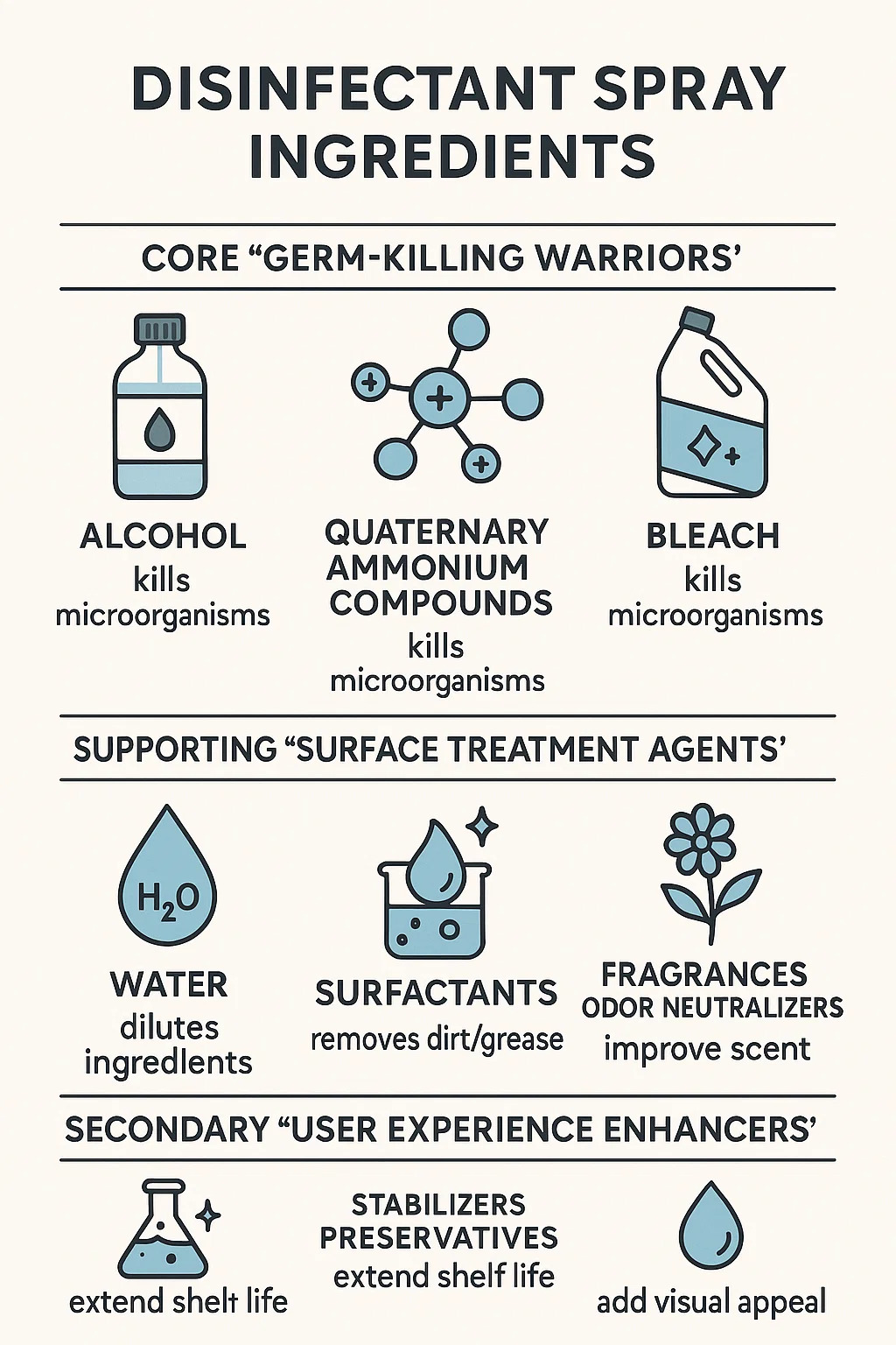 Att skapa en effektiv desinfektionsspray , kan de viktigaste "hjälte"-ingredienserna i stora drag kategoriseras enligt följande: